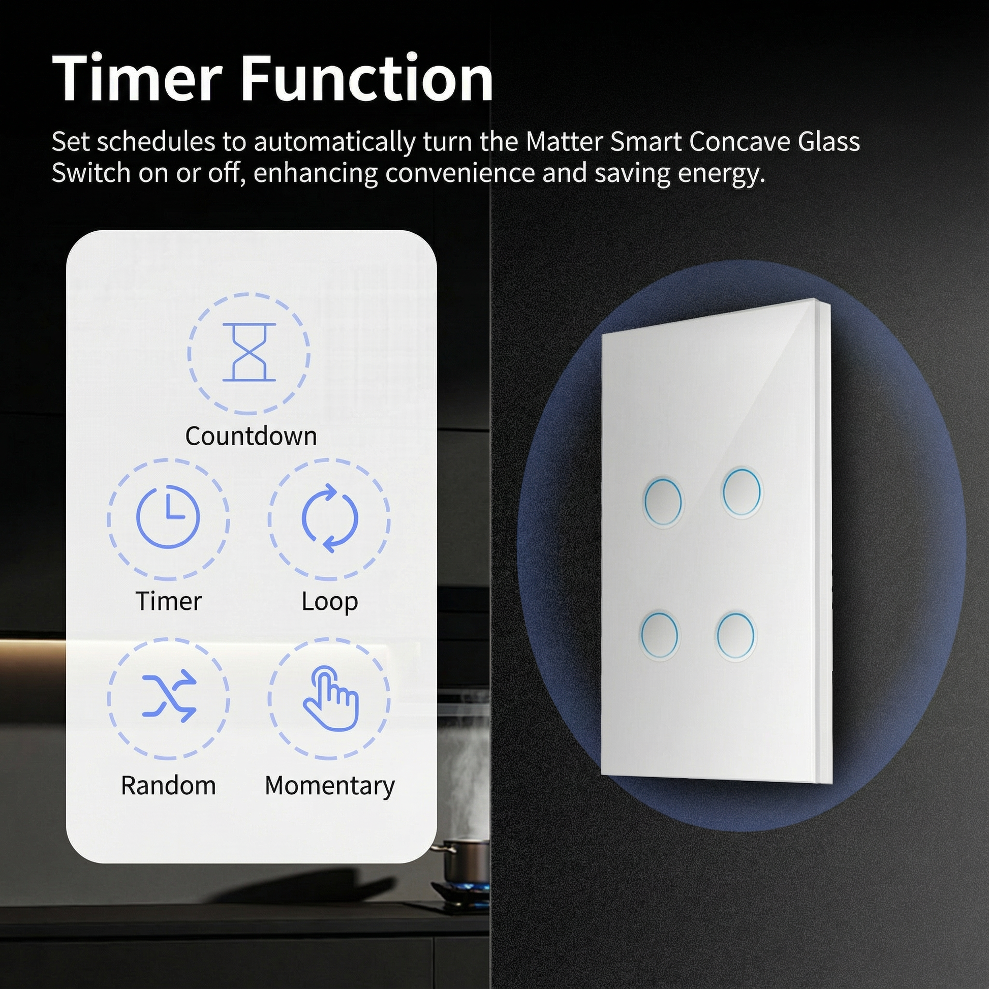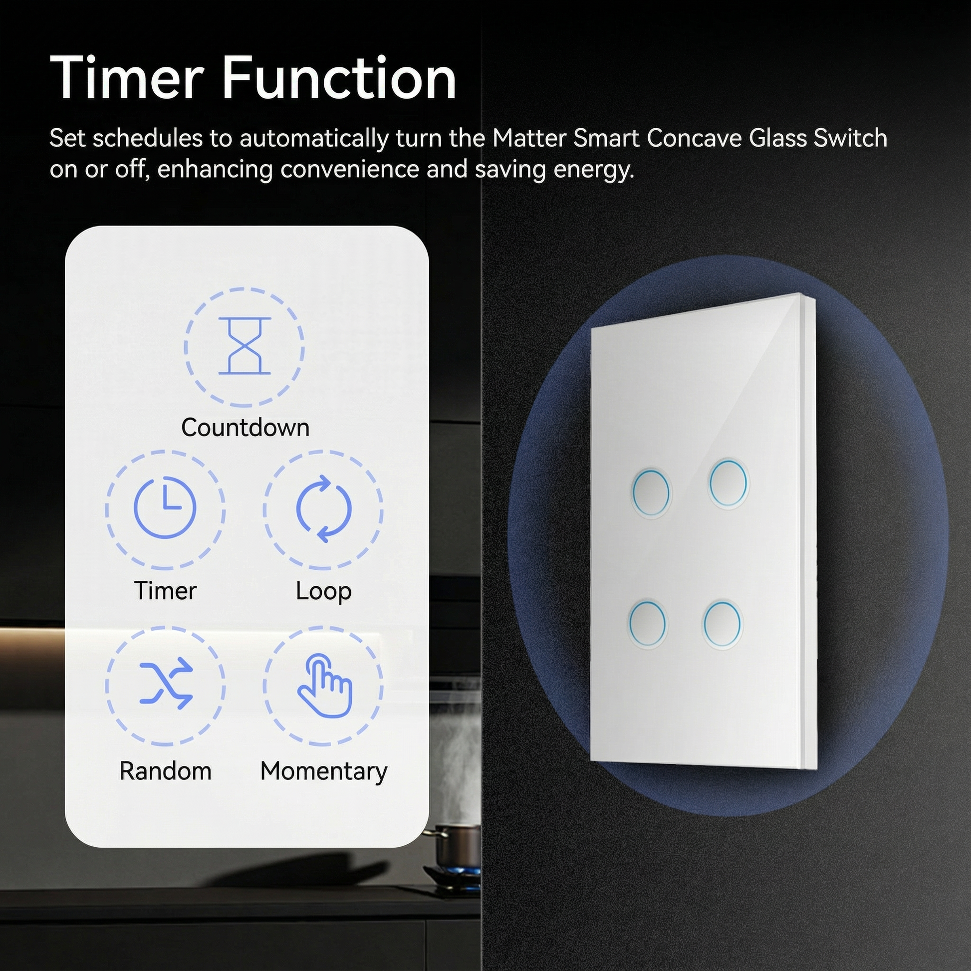 Diseño Premium de Vidrio Cóncavo: Superficie táctil elegante que responde naturalmente a la luz, creando una estética sofisticada mientras proporciona control intuitivo