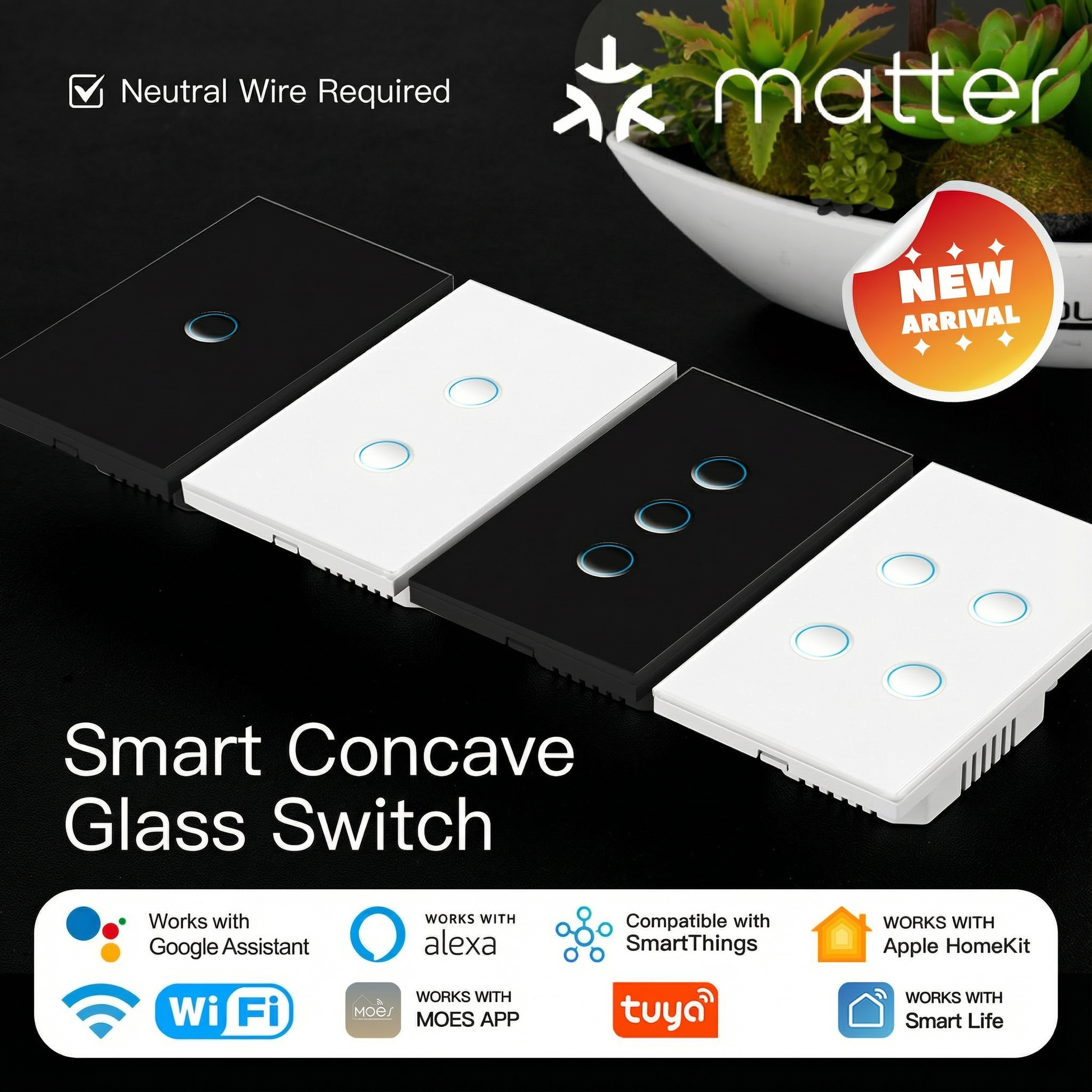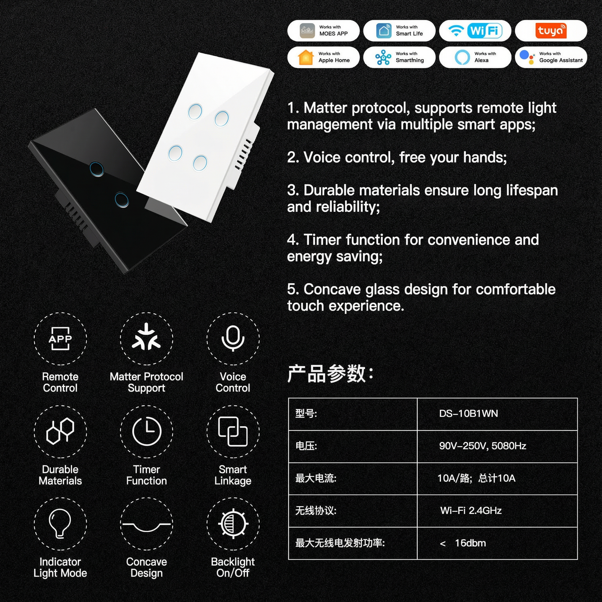 Compatibilidad Universal: El protocolo Matter asegura integración perfecta con Apple HomeKit, Google Home, Amazon Alexa y más—un interruptor, una app, posibilidades infinitas