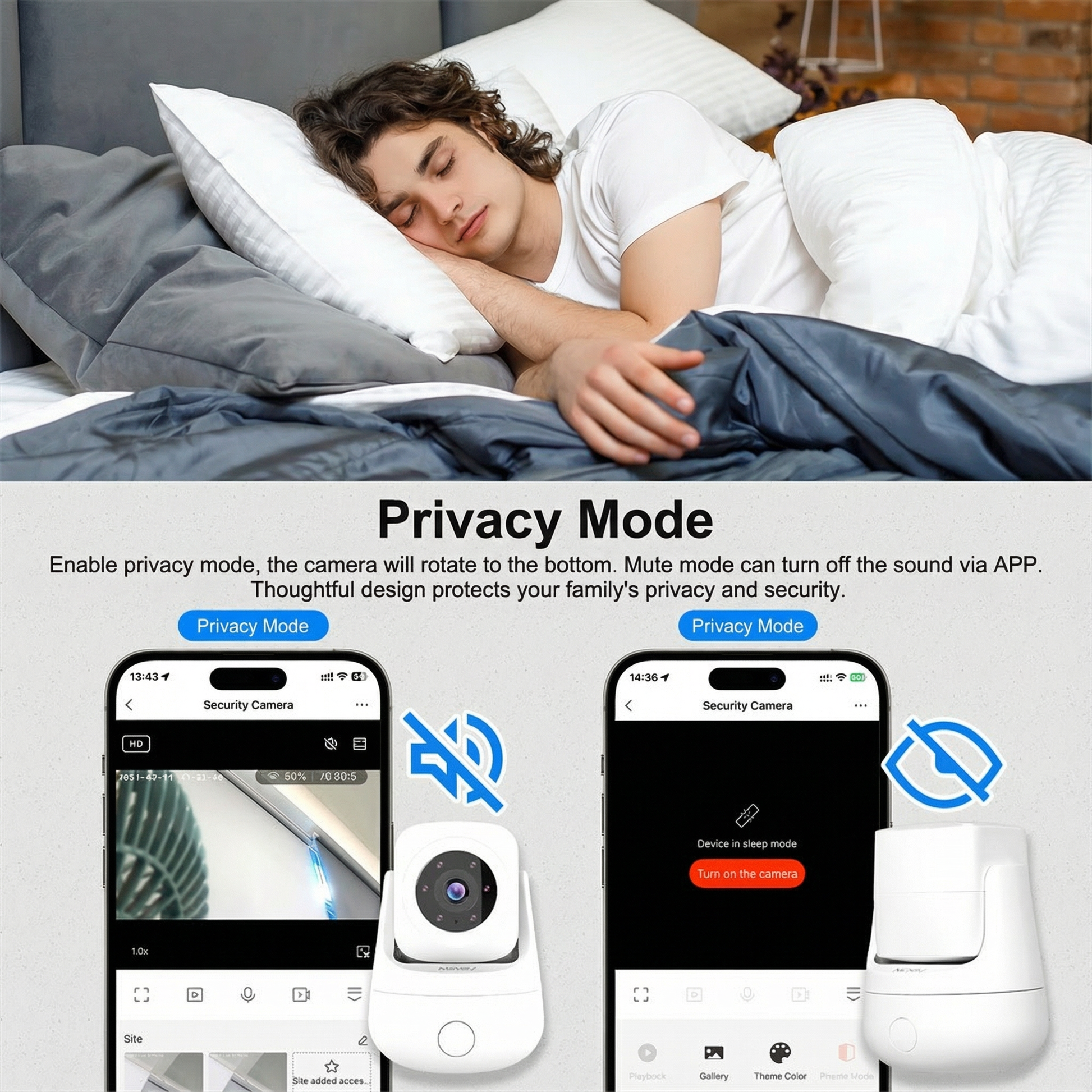 Ative o modo de privacidade para retrair fisicamente a lente da câmera quando estiver em casa. O modo silencioso silencia as notificações de áudio pelo aplicativo, dando a você controle total sobre a privacidade da sua família, mantendo a segurança.