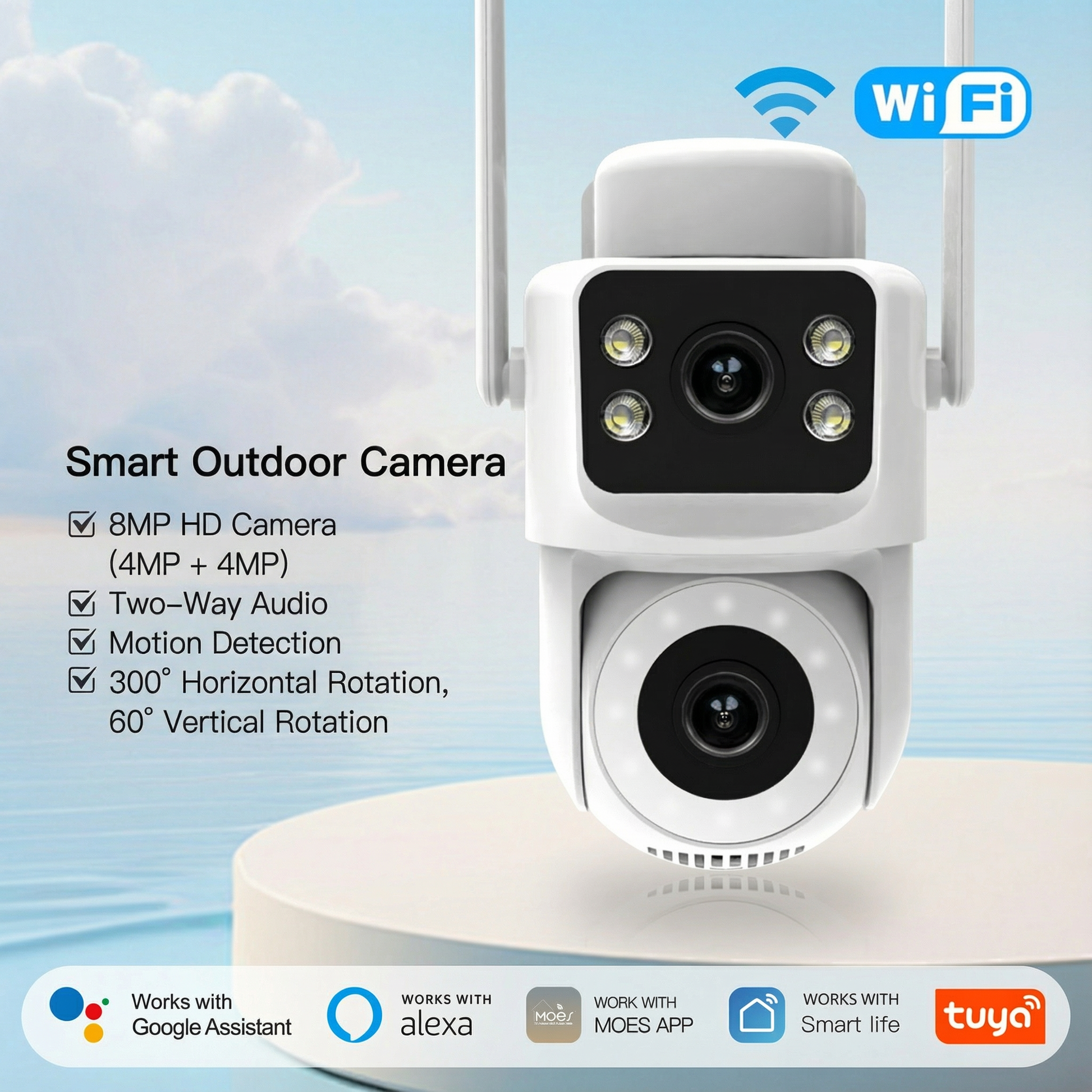 • Iluminação integrada: A função de iluminação integrada proporciona visibilidade nítida na escuridão total. Controle as luzes através do aplicativo MOES ou defina horários automáticos (20:00-22:00) para dissuadir intrusos.