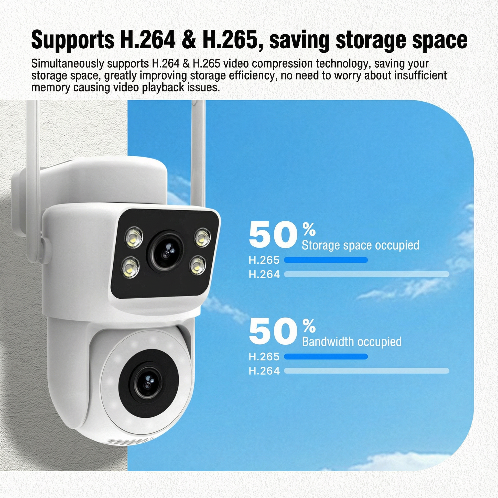• Compressão H.264 e H.265: Economize 50% de espaço de armazenamento e largura de banda com compressão de vídeo avançada – armazene o dobro de gravações sem sacrificar a qualidade.