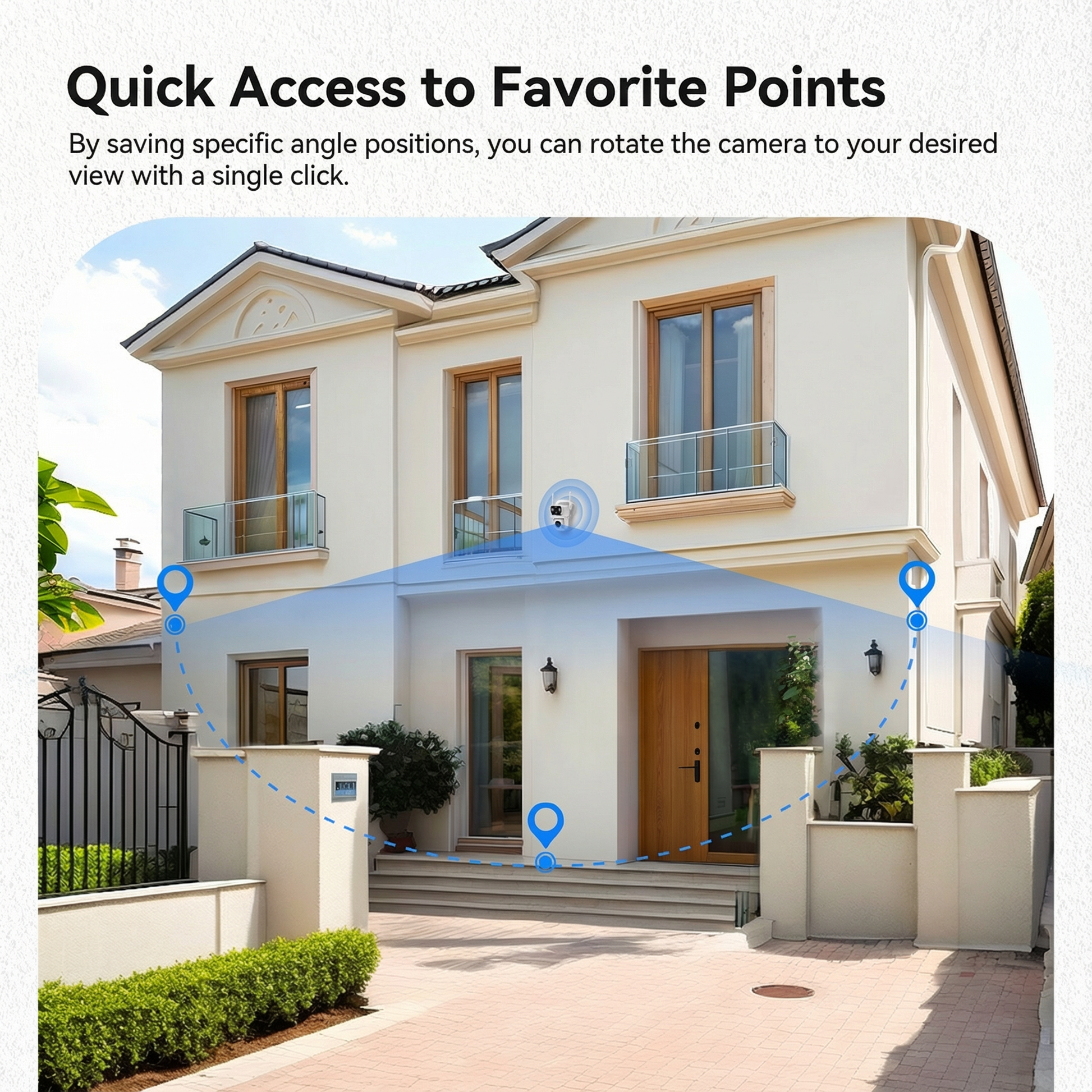 • Favoritos de acesso rápido: salve ângulos de câmera específicos e acesse instantaneamente as áreas que deseja monitorar – perfeito para verificar pontos de entrada, entradas de garagem ou pontos cegos com um único toque.